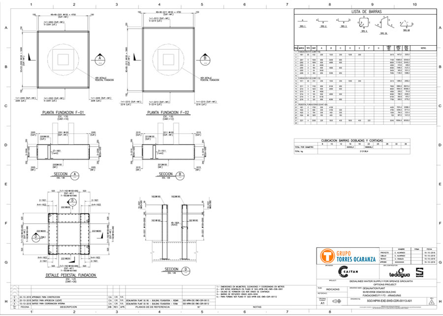 PROYECTAR participo en el desarrollo de planos de Detallamiento de Armaduras para Fundaciones Equipos Generales, Edificios Industriales, Toma de Agua, Salas Eléctricas, Losas, Radieres, Canaletas y Obras Menores.